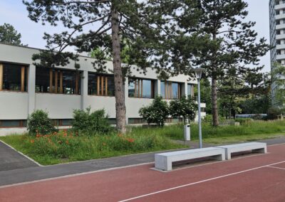Neue Sitzgelegenheiten wurden differenziert im Areal verteilt und bieten vielfältige Aufenthaltsmöglichkeiten für Pausen, Unterricht im Freien und informelle Treffen. Gestaltung, Materialisierung und Anordnung der Möblierung nehmen Bezug auf die Architektur und Freiraumgestaltung der Entstehungszeit und fügen sich selbstverständlich in das Gesamtbild ein.