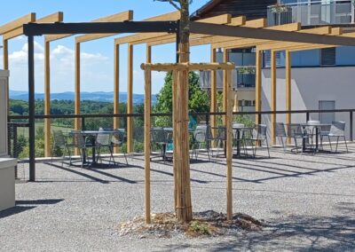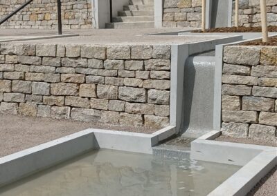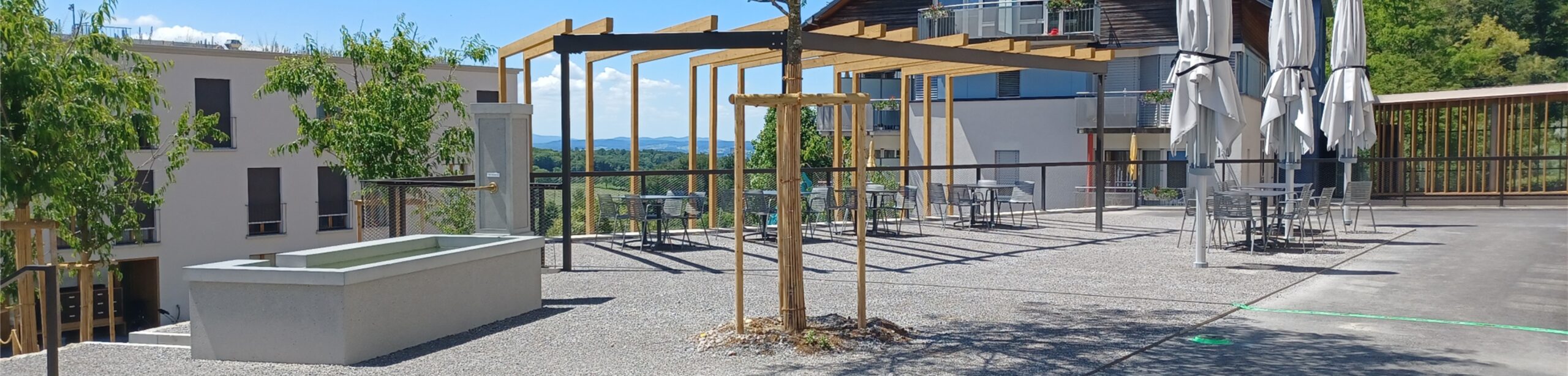 Der Generationenpark St. Chrischona in Bettingen präsentiert sich als harmonisch in die umgebede Landschaft eingebettetes Zentrum für Begegnung, Pflege und Wohnen. Die Umgebungsgestaltung schafft mit fliessenden Übergängen zwischen bebauten und naturnahen Bereichen einen Ort der Ruhe, Offenheit und Lebensqualität für alle Generationen. Im Herzen des Parks befindet sich ein repräsentatives Zentrum, das von einem sanft plätschernden Bachlauf durchzogen wird. Dieser wird von einem Glockenturm akzentuiert, der als identitätsstiftendes Element weithin sichtbar ist und dem Ort eine ruhige, würdige Atmosphäre verleiht. Ein geschützter Demenzgarten bietet den Bewohnerinnen und Bewohnern des Alterswohnens einen sicheren und gleichzeitig naturnahen Rückzugsort. Die liebevoll gestaltete Bepflanzung, Sitznischen und ein barrierefreier Rundweg fördern Orientierung, Wohlbefinden und Aufenthaltsqualität in geschütztem Rahmen. Ein Aussenkaffee mit grosszügiger Pergola lädt Bewohner:innen, Besucher:innen und Spaziergänger:innen zum Verweilen ein.